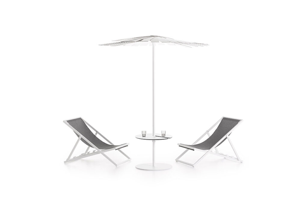 Le parasol se distingue par un système de pliage unique avec des lames qui se chevauchent, inspiré d’un éventail, qui permet de régler le parasol. La nouveauté de 2025 est un plateau rond réglable en hauteur, qui sert de table d’appoint ou de bar. En outre, il existe un grand coussin de siège rond qui peut être agrandi avec un dossier et un plateau supplémentaire. Ces innovations font d’Ensombra une solution d’extérieur polyvalente.